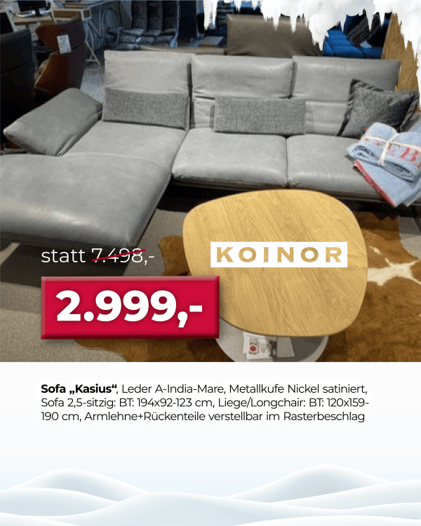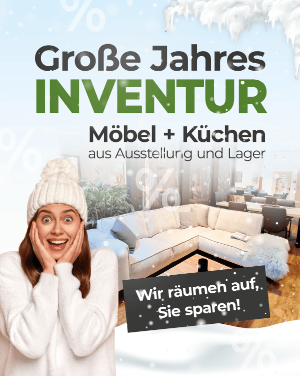 Bei unserer Inventur-Verkauf-Aktion sichern Sie sich bis zu 55 % Rabatt auf eine große Auswahl hochwertiger Ausstellungsstücke. Profitieren Sie von Top-Qualität zu stark reduzierten Preisen und entdecken Sie attraktive Angebote in allen Abteilungen. Ob modern, klassisch oder zeitlos: Unser Inventurverkauf bietet Ihnen eine außergewöhnlich große Auswahl an geprüften Ausstellungsstücken aus sämtlichen Abteilungen. Alle Produkte überzeugen durch hochwertige Verarbeitung, erstklassige Materialien und ein hervorragendes Preis-Leistungs-Verhältnis.