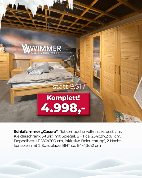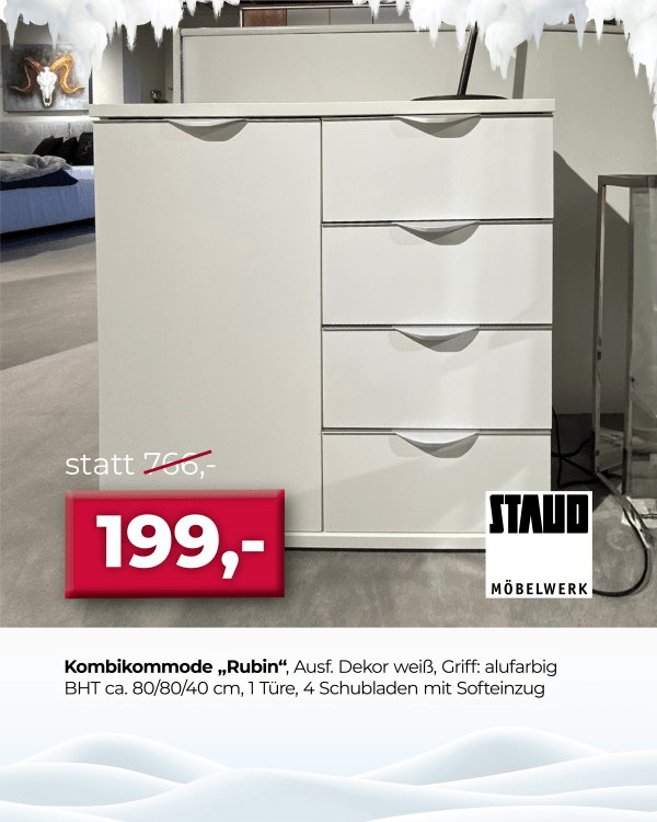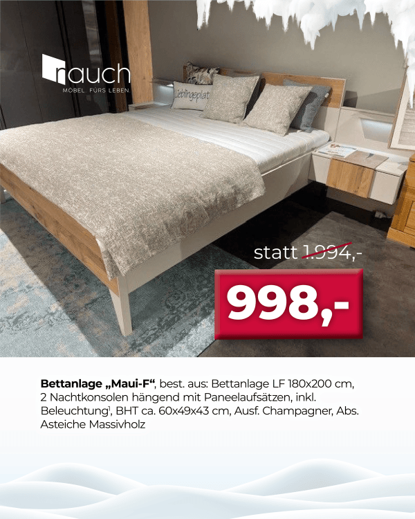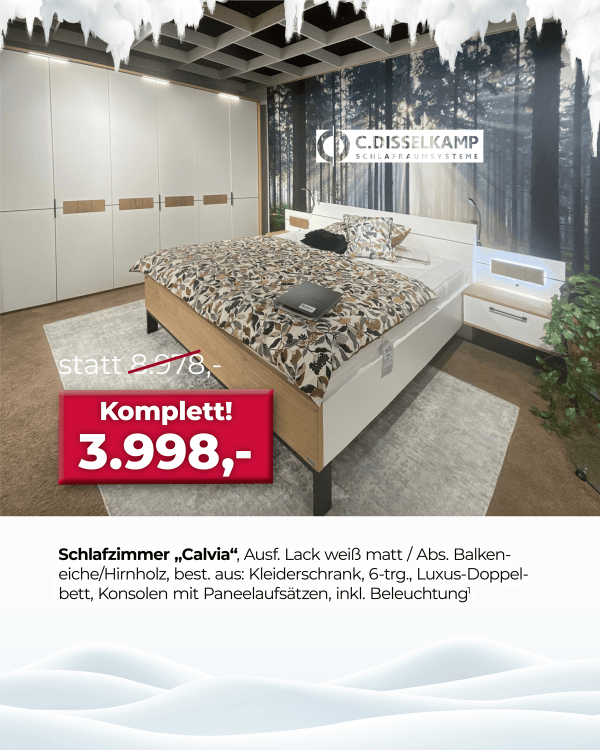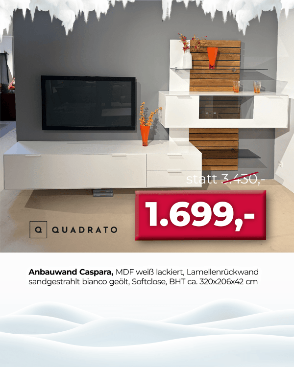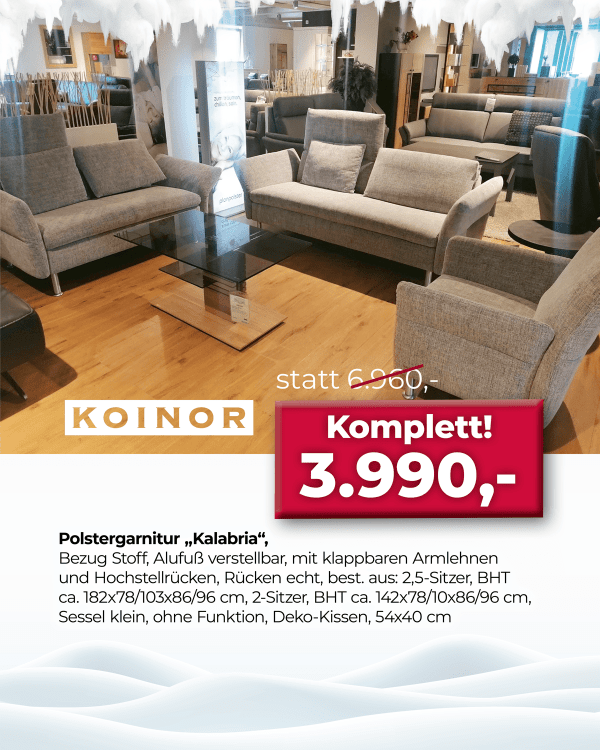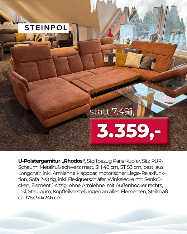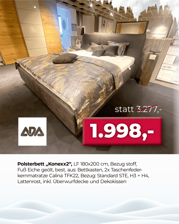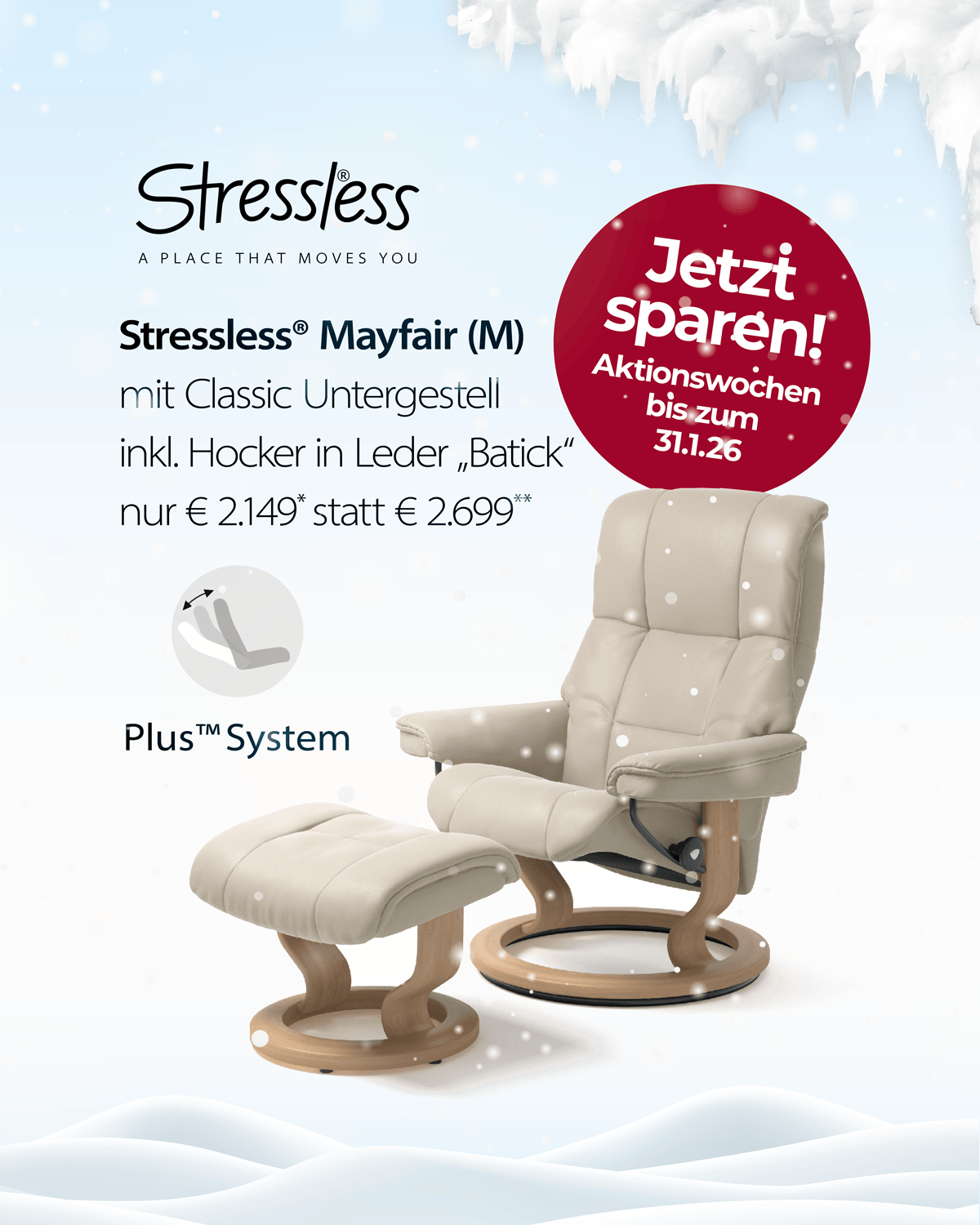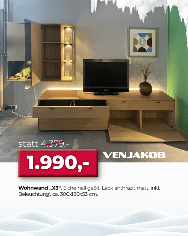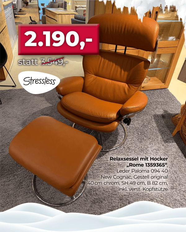 *Gültig für Neumöbel-Bestellungen ab sofort bis 7.2.2026. Nicht anrechenbar auf reduzierte Ausstellungsstücke, Ware der Firma Relax, Werbe-/Aktions-/Hauspreise und bereits getätigte Aufträge.