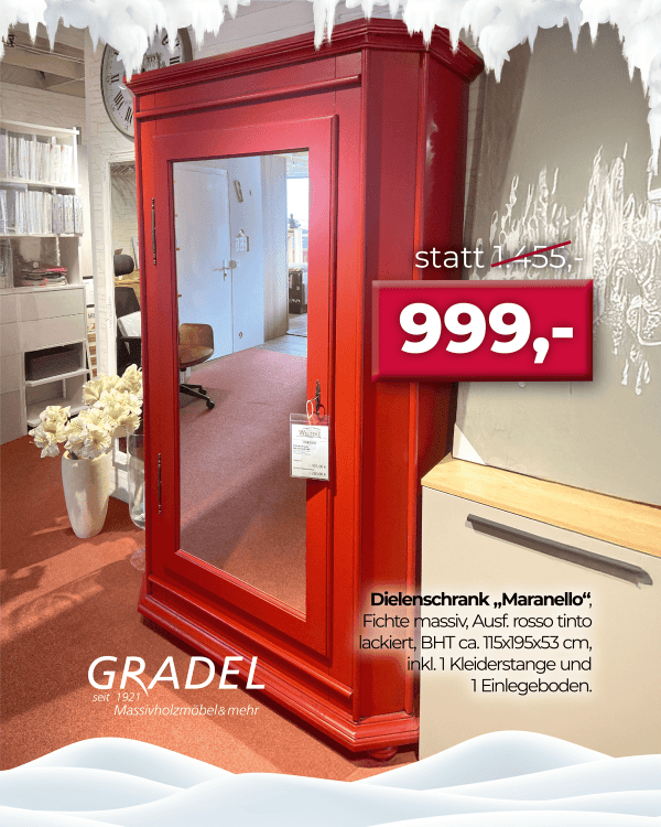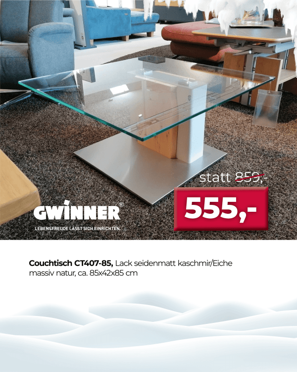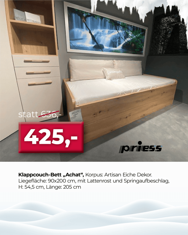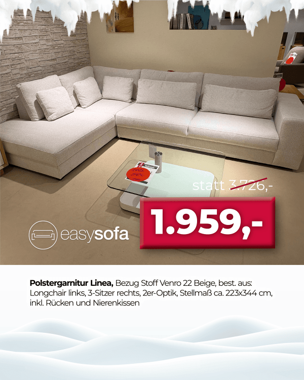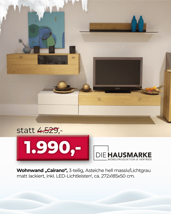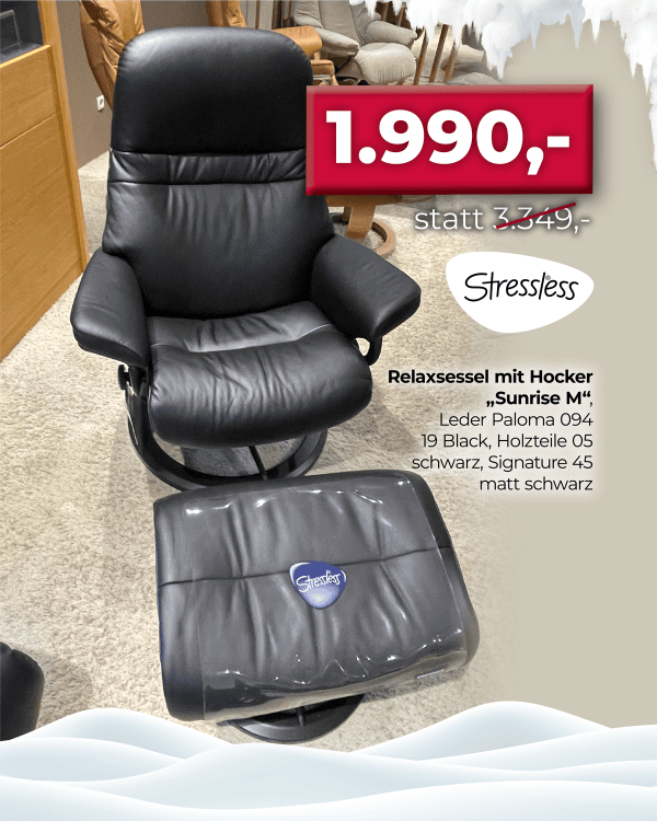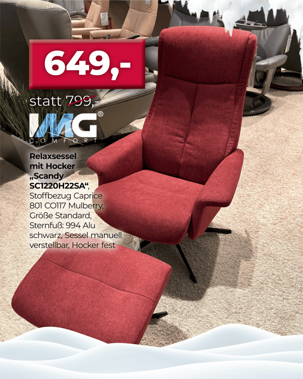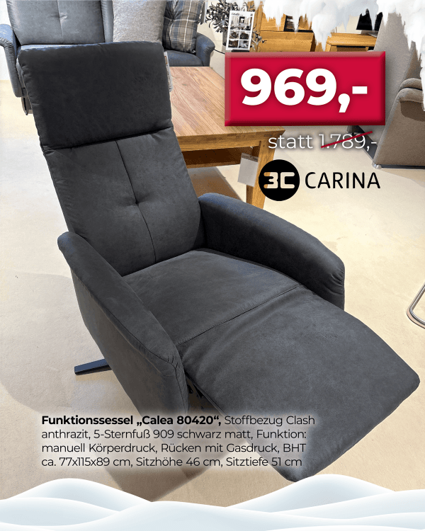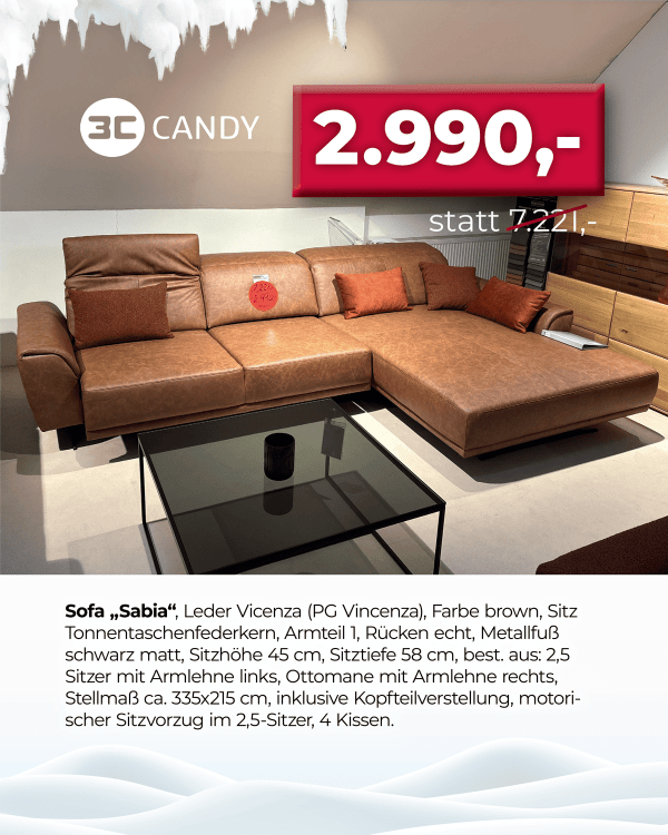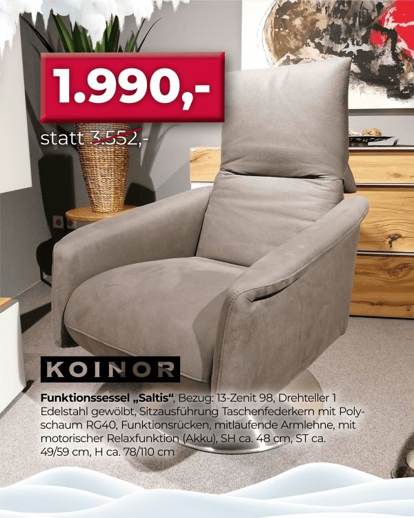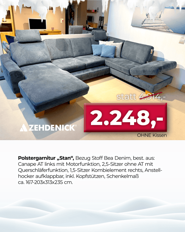 *Gültig für Neumöbel-Bestellungen ab sofort bis 7.2.2026. Nicht anrechenbar auf reduzierte Ausstellungsstücke, Ware der Firma Relax, Werbe-/Aktions-/Hauspreise und bereits getätigte Aufträge.