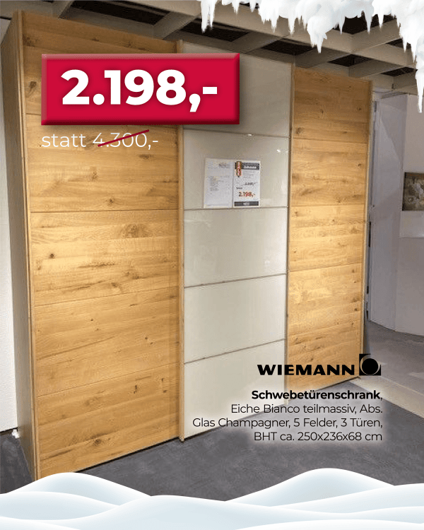 Bei unserer Inventur-Verkauf-Aktion sichern Sie sich bis zu 55 % Rabatt auf eine große Auswahl hochwertiger Ausstellungsstücke. Profitieren Sie von Top-Qualität zu stark reduzierten Preisen und entdecken Sie attraktive Angebote in allen Abteilungen. Ob modern, klassisch oder zeitlos: Unser Inventurverkauf bietet Ihnen eine außergewöhnlich große Auswahl an geprüften Ausstellungsstücken aus sämtlichen Abteilungen. Alle Produkte überzeugen durch hochwertige Verarbeitung, erstklassige Materialien und ein hervorragendes Preis-Leistungs-Verhältnis.