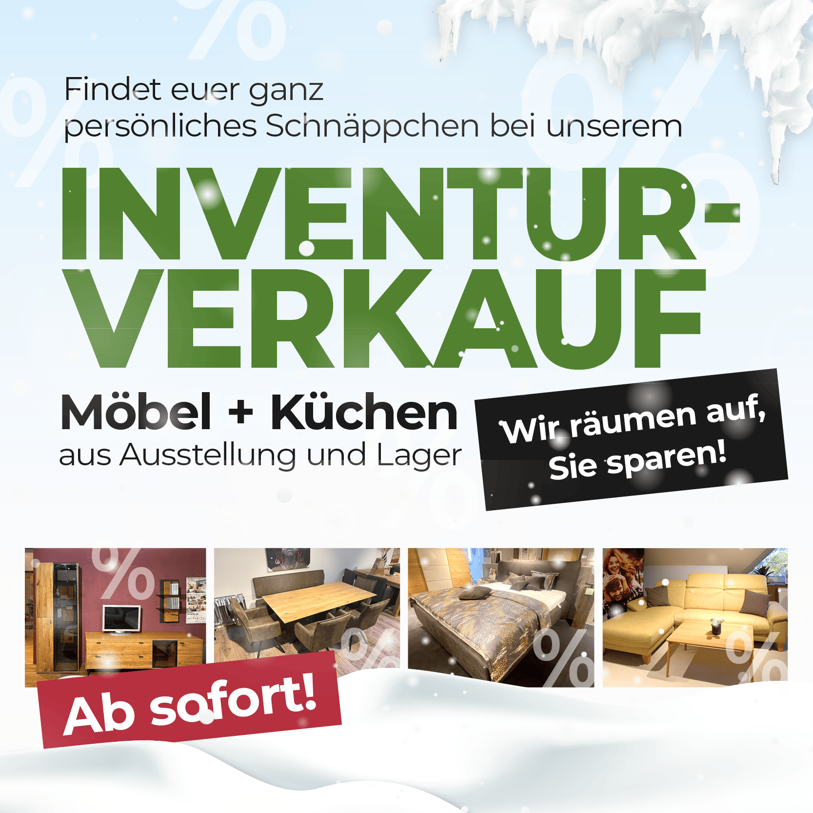 es ist wieder soweit: Die gesetzlich vorgeschriebene Inventur kommt auf uns zu. Wir nutzen daher die nächsten Tage, um unseren Warenbestand im Vorfeld der Zählung zu reduzieren. Helfen Sie uns dabei – denn wir trennen uns von durchweg neuwertigen Ausstellungsmöbeln und -Küchen.